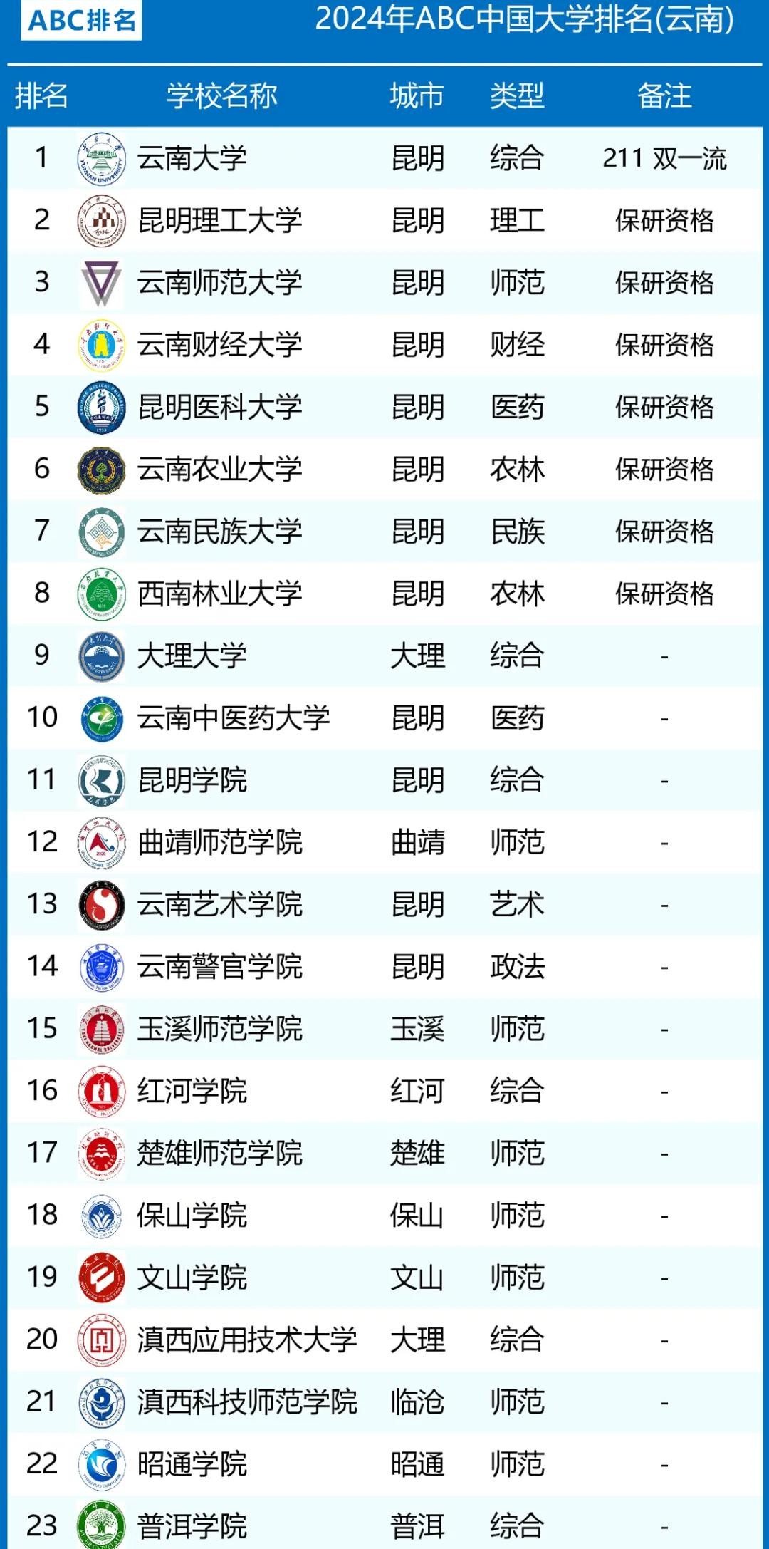 根据2024年ABC中国大学排名(云南),云南高校排名也是最新出炉,从整体来看,全省的优质高校基本集中在省会昆明,像省内前十高校中,有9个都在昆明。简单来看: