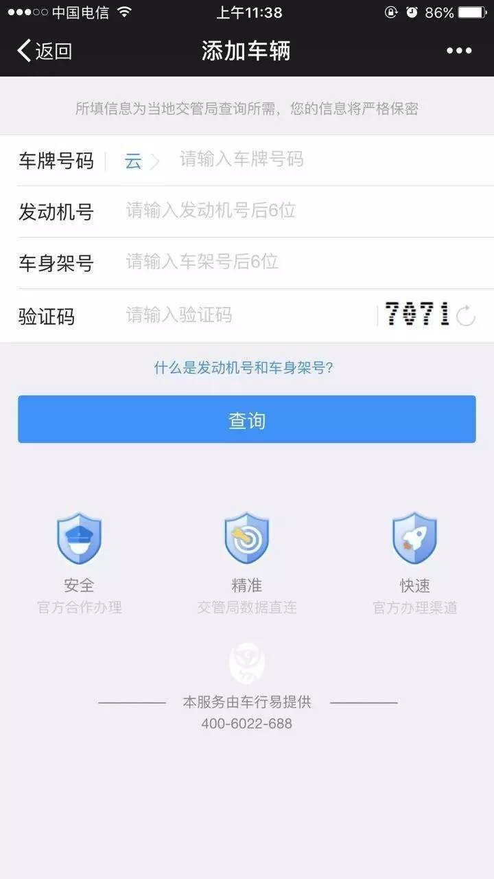 点击链接后会看到这样的一个界面,拿出你的行驶证,输入车牌号码、发动机号后6位、车身架号后6位以及验证码之后点击查询,就能跳转到下一个界面。