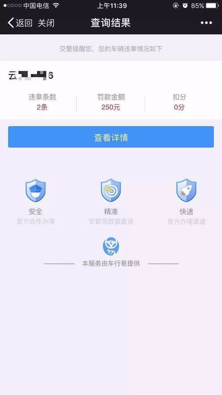 在这里,大家已经能看到自己爱车的违章信息了,点击详情,还能查到详细的违章时间、地点和违章类型。