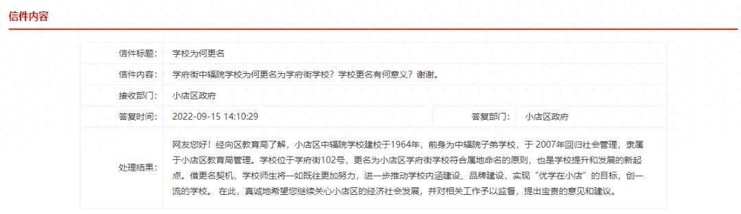 网友:学府街中辐院学校为何更名为学府街学校?学校更名有何意义?