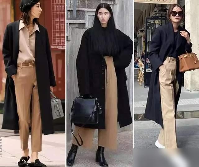 如果我们选择颜色比较特殊的卡其色裤子,比如带一些驼色调的卡其色裤子,那么这些裤子与黑色之间的对比就会更加温柔,加上它们带有一定亮度,会让造型更加显得高级。