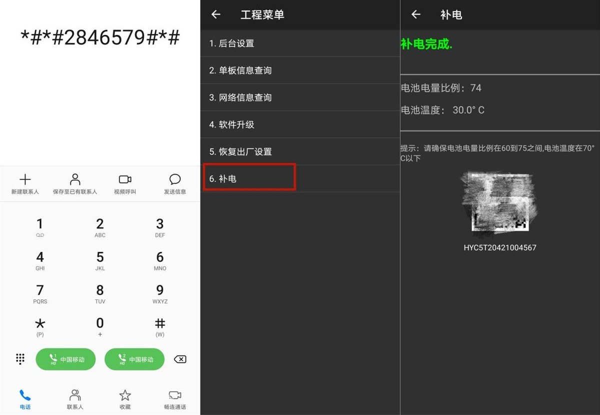打开手机拨号界面,输入【*#*#2846579#*#*】,手机将自动跳转打开,点击【补电】-即可查看电池温度并补电。