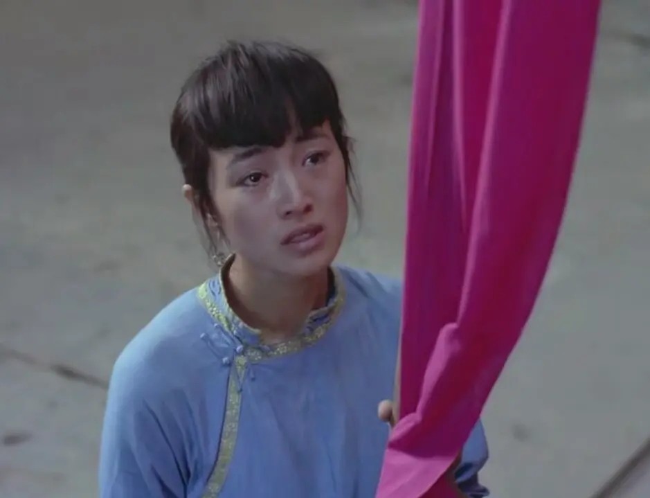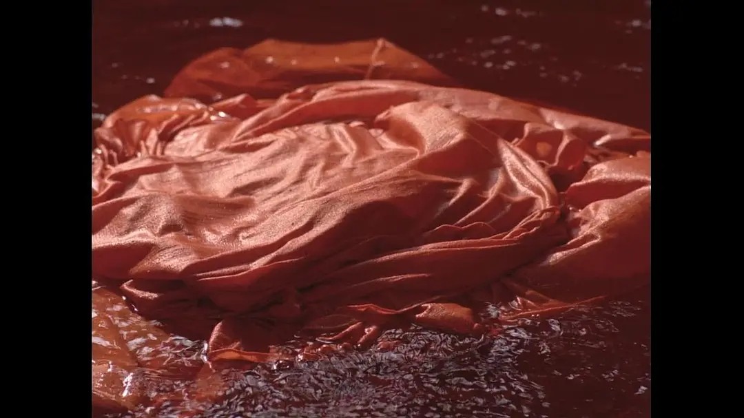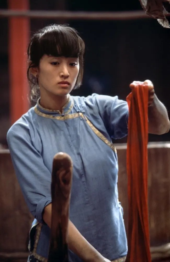 于是菊豆被杨天青扑倒在染坊顶上,那哗哗落入染池的大红色绸缎,既代表喷薄而出的欲望,也象征了菊豆苦苦求生的火焰。