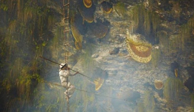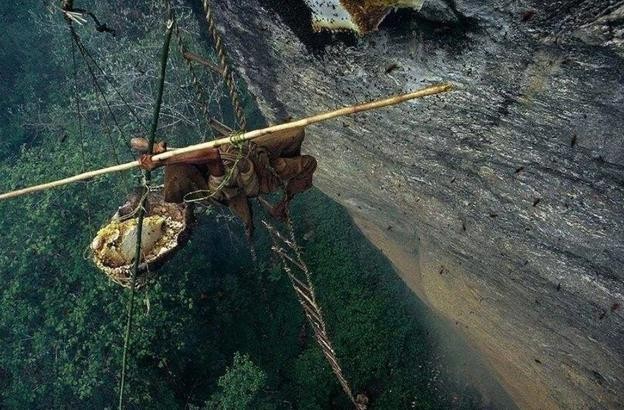 生活在喜马拉雅山附近的采蜜人就会冒着生命危险到悬崖上进行采蜜。他们会事先在山上放一个绳梯下去。到了悬崖之下先利用烟熏把蜜蜂给驱赶一部分,然后再用简单的工具将蜂蜜快速的取下。喜马拉雅悬崖蜂个头要比普通蜜蜂大很多。它们经常生活在海拔1000到三千米的悬崖之下。