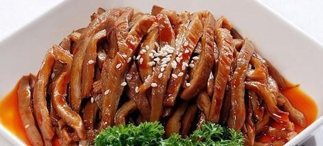 猪肚洗干净,焯水后卤制卤制30分钟,浸泡45分钟;