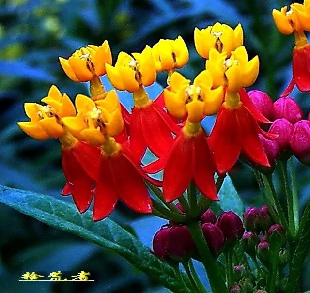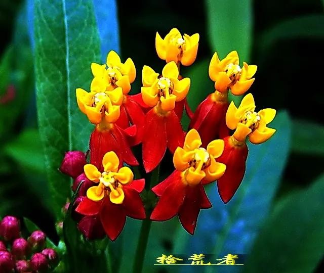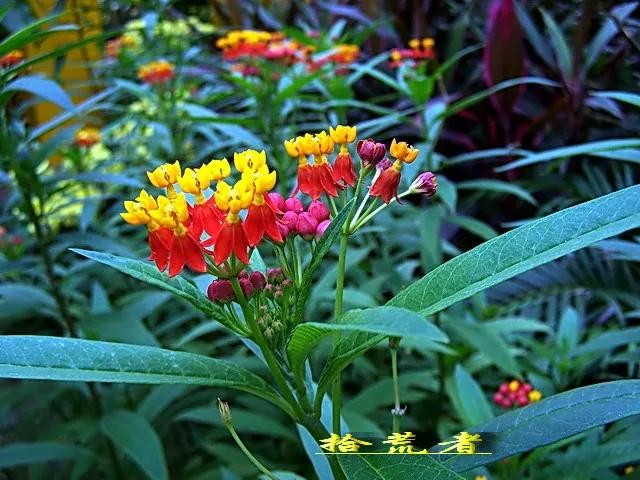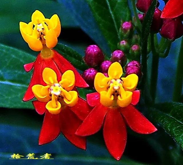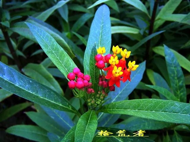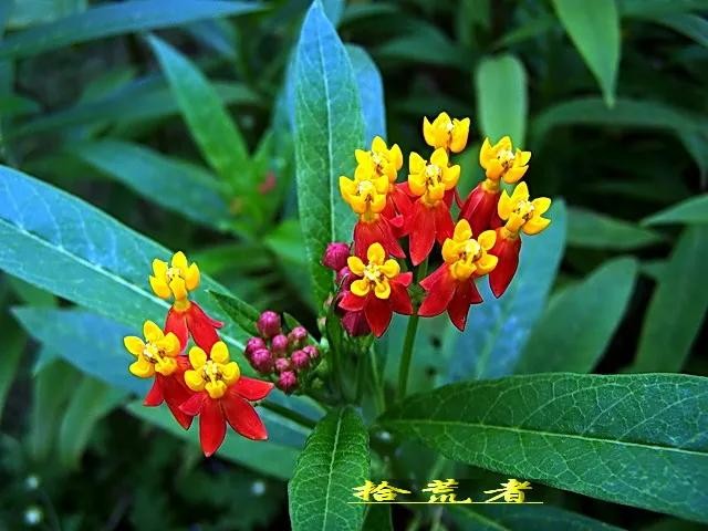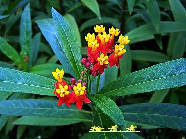 别名:莲生桂子花,芳香花,水羊角。箩摩科,马利筋属。多年生亚灌木状草本植物。伞状花序,顶生或腋生,花艳丽如火,供美化园林及观赏用。全株有毒,人及大牲畜误食可致,呕吐,痉挛,昏迷,心律失常,死亡。原产:南美热带。谢分享。