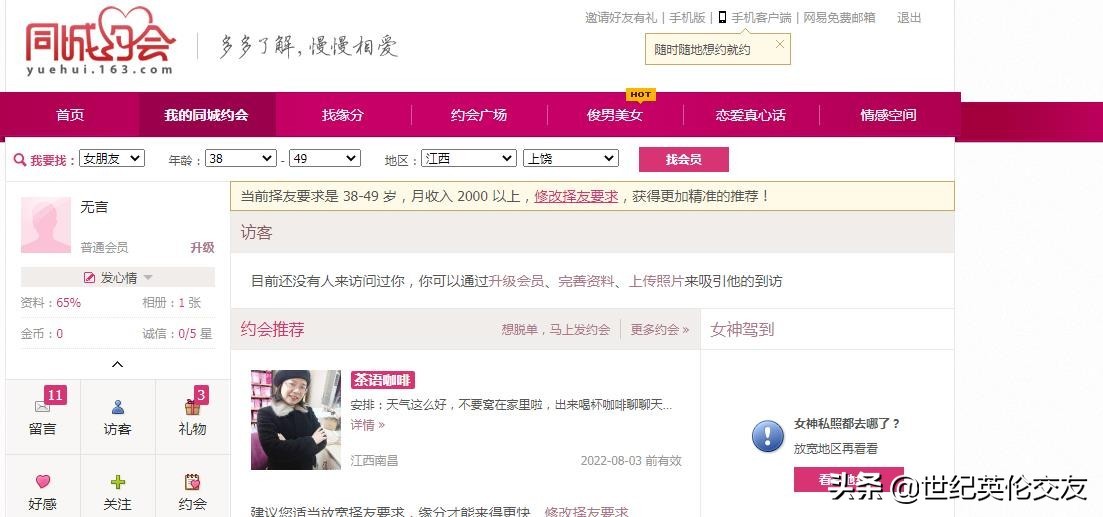 网易同城作为网易公司交友社区(网易v交友,网易非常男女,网易同城约会)三大品牌之一的网易同城约会是主要面向高素质,渴望爱情婚姻的单身人士精心打造的安全交友约会平台,旨在帮助会员通过网络结识新朋友,在约会中找到真爱。