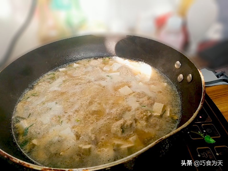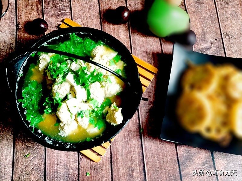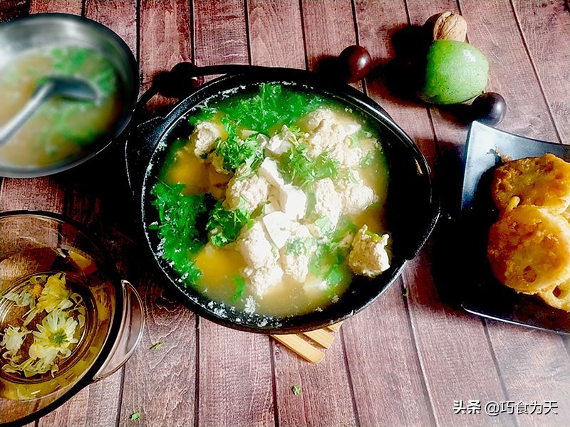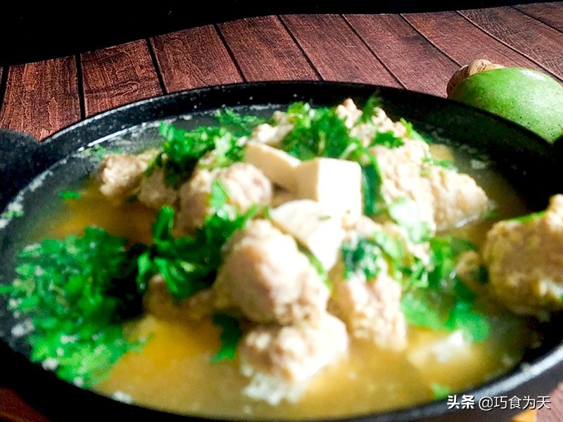 当丸子断生变白后, 下入准备好的豆腐。炖煮五分钟,加入盐,鸡精,调味出锅,出锅后撒上香菜,葱花即可。