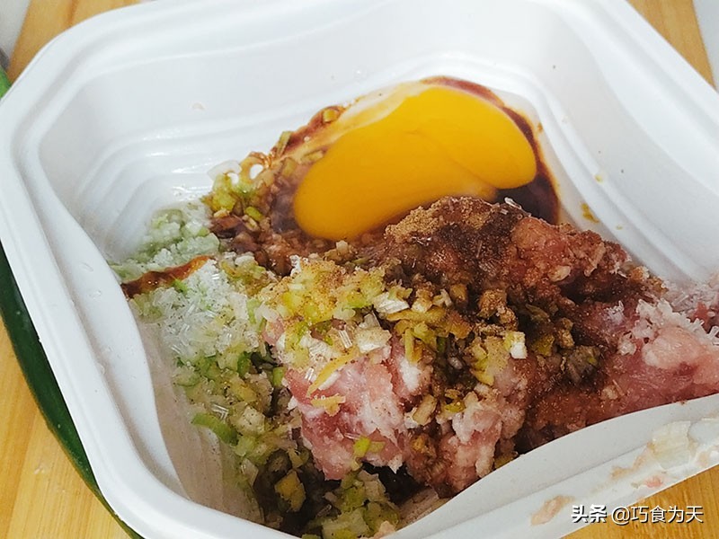 切好的猪肉里加入葱,姜末。然后打入一个鸡蛋,加入盐,十三香,酱油,蚝油,鸡精,喝少量的清水。向一个方向搅打上劲儿,放在一边备用。