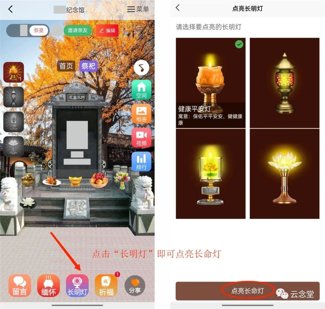 如若要为逝者点灯,可点击下方的“长明灯”按钮,选择要为逝者点亮的长命灯,即可点亮长明灯。