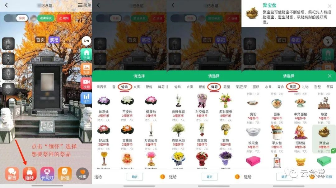 第五步,进入逝者纪念馆,点击下方的“缅怀”按钮,在祭品列表中选择需要的祭品,点击“确定”按钮,即可为逝者献上祭品。