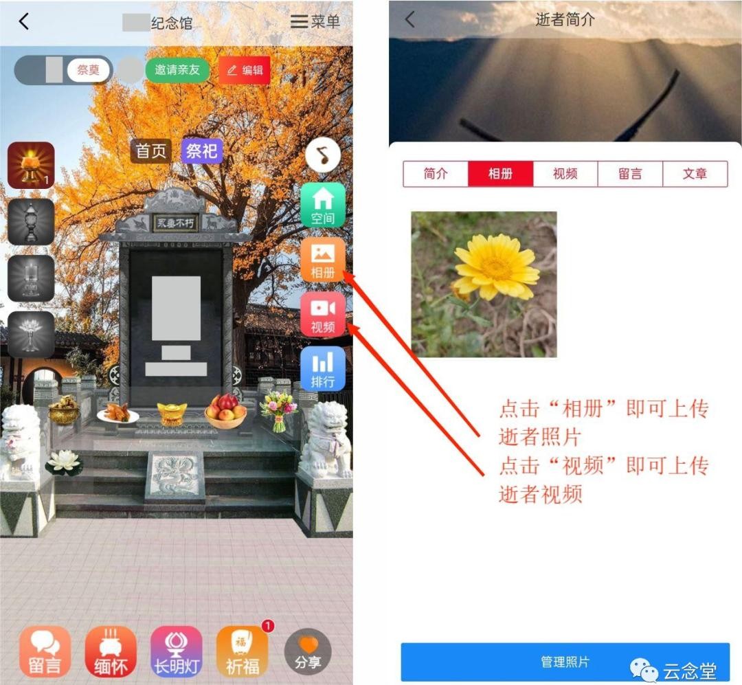 第七步,点击右侧“相册”按钮,即可上传逝者照片;右侧的“视频”按钮可上传与逝者生平相关的视频。