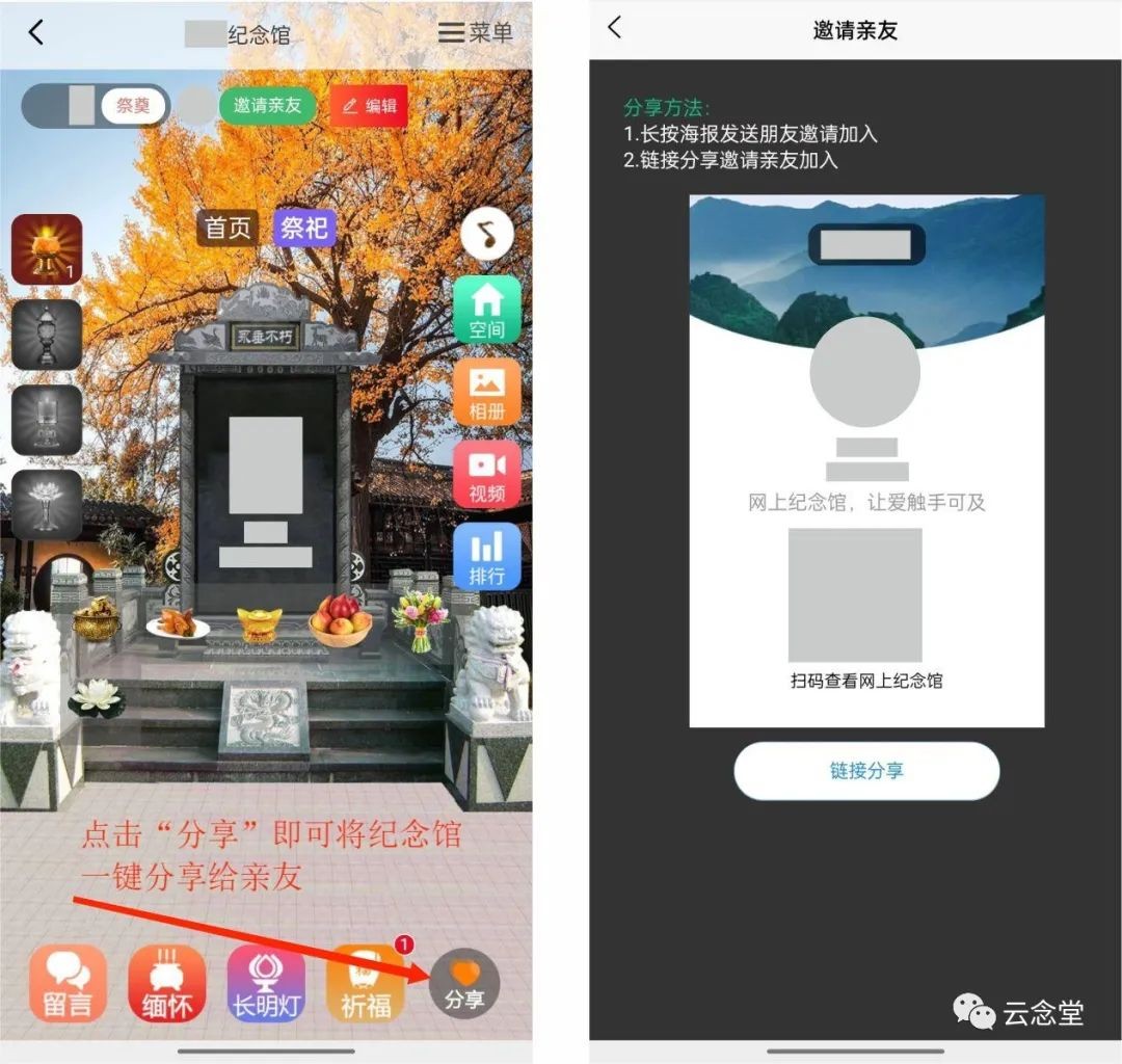 第九步,点击下方的“分享”按钮,即可将纪念馆一键分享给亲友,一起进行祭奠和缅怀逝者,共同完善和记录逝者生平,让逝者音容能够永久留存。