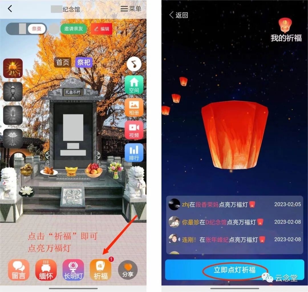 第六步,点击下方“祈福”按钮,即可为逝者点亮万福灯。可以选择默认的祈愿语,也可自行编辑。