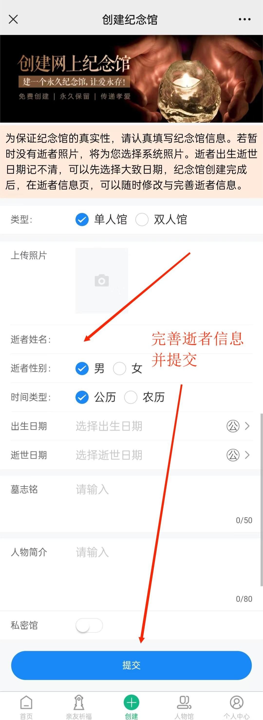 第三步,根据要求输入逝者信息,信息输入完毕之后,确认信息无误(后期可完善),即可提交完成创建纪念馆【如若您不希望创建的纪念馆对外公开,可在创建纪念馆时,将纪念馆设为“私人馆”,成为私人馆之后,除了共同亲友,其他人进入馆内则需要输入密码才能进入】。