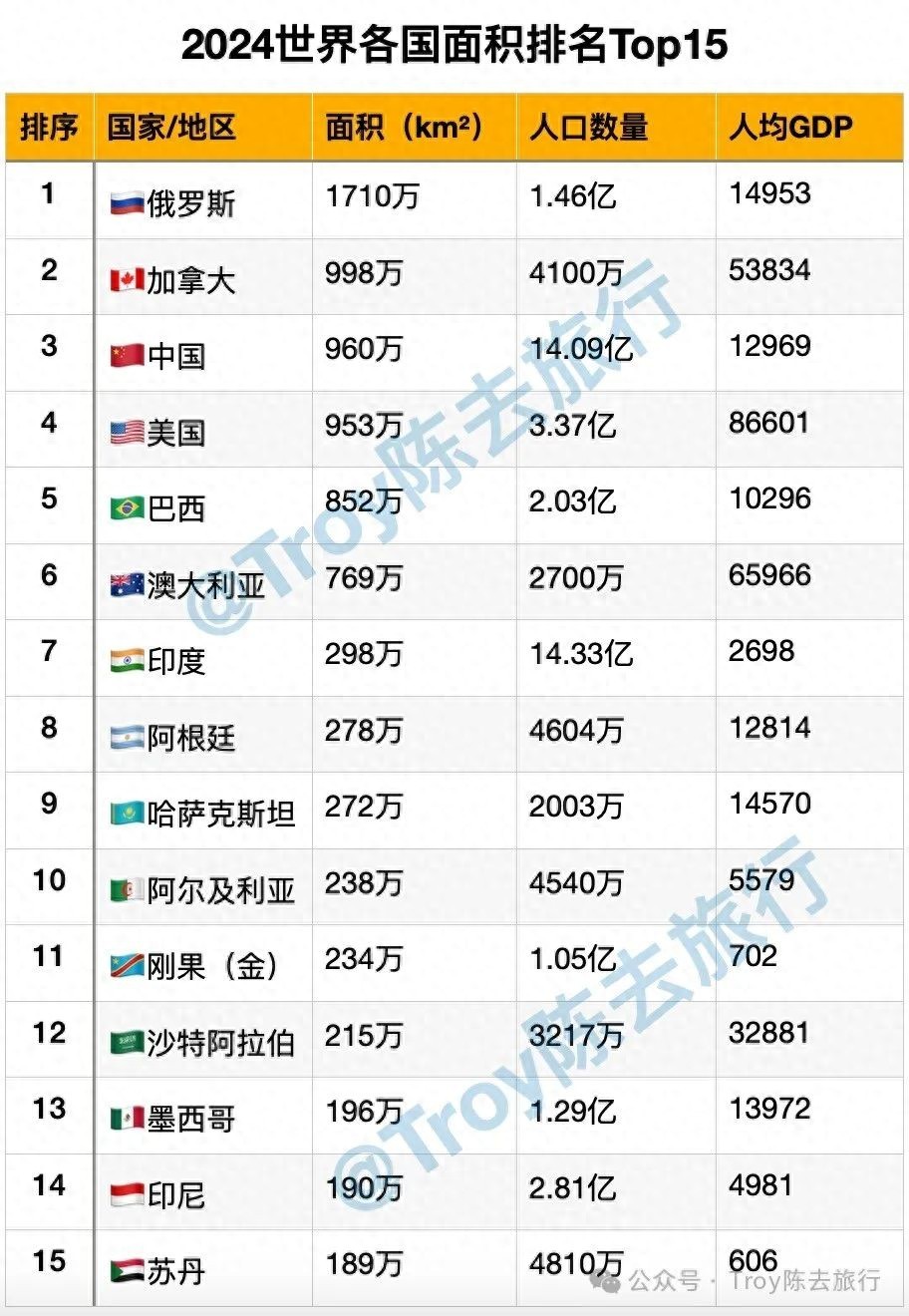 全球有众多国家,但各国在面积大小,人口规模,经济水平等都不尽相同,本文列举世界各国陆地面积排名前十五名的国家地区,面积仅指陆地面积,省略后面小数点,人口为大约数据,人均GDP(人均国内生产总值)为2024年IMF预测数据,货币单位为美元。排名如下: