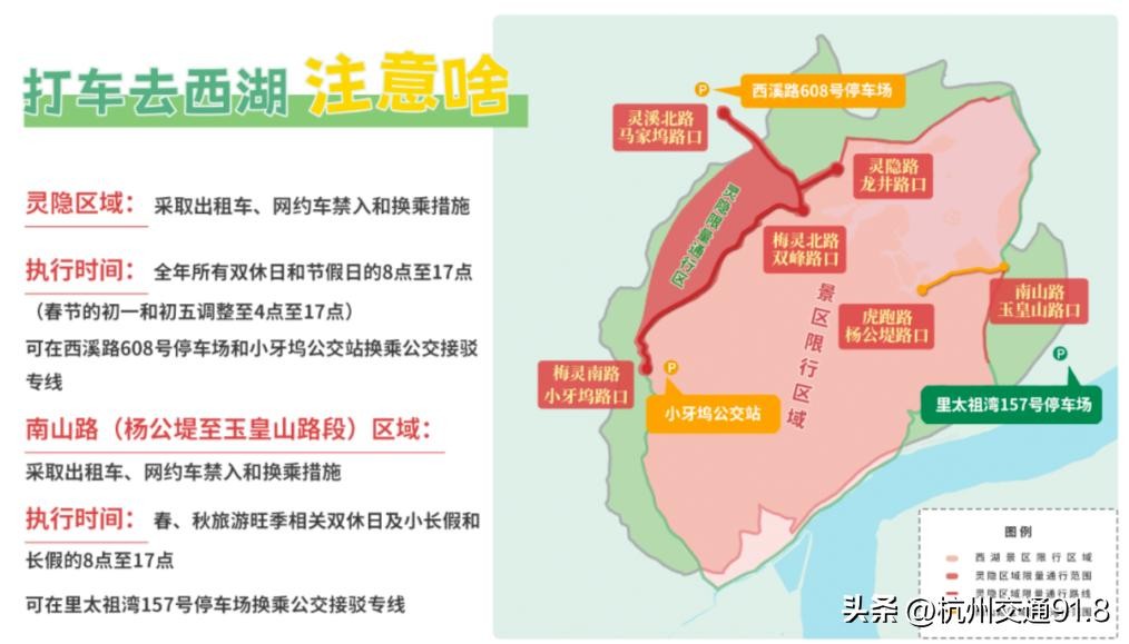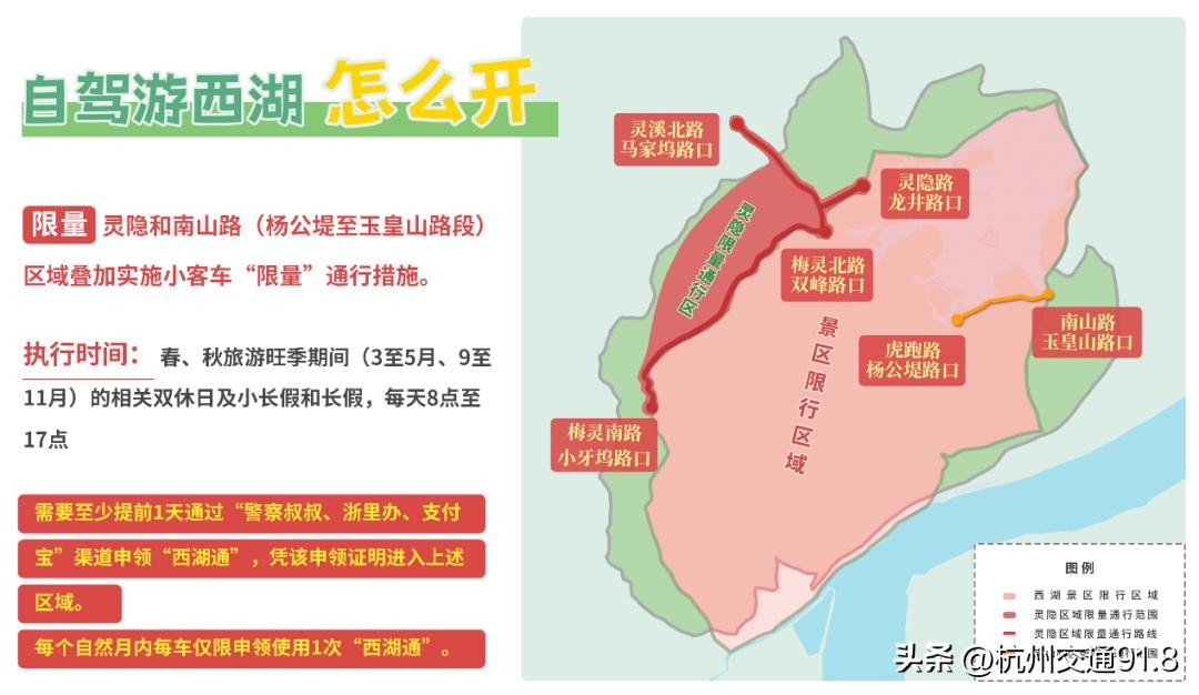 在西湖景区全域“单双号”通行政策基础上,国庆假期每天8时至17时,在灵隐和南山路(杨公堤至玉皇山路段)区域叠加采取预约通行措施,小客车进入上述区域,需提前1天通过“警察叔叔、浙里办、支付宝”渠道申领“西湖通”,凭该申领证明进入上述区域,每个自然月内每车仅限申领使用1次“西湖通”。
