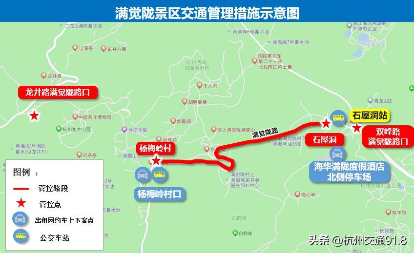 1. 满觉陇路(石屋洞至杨梅岭村路段)禁止机动车通行(内部居民车辆除外);