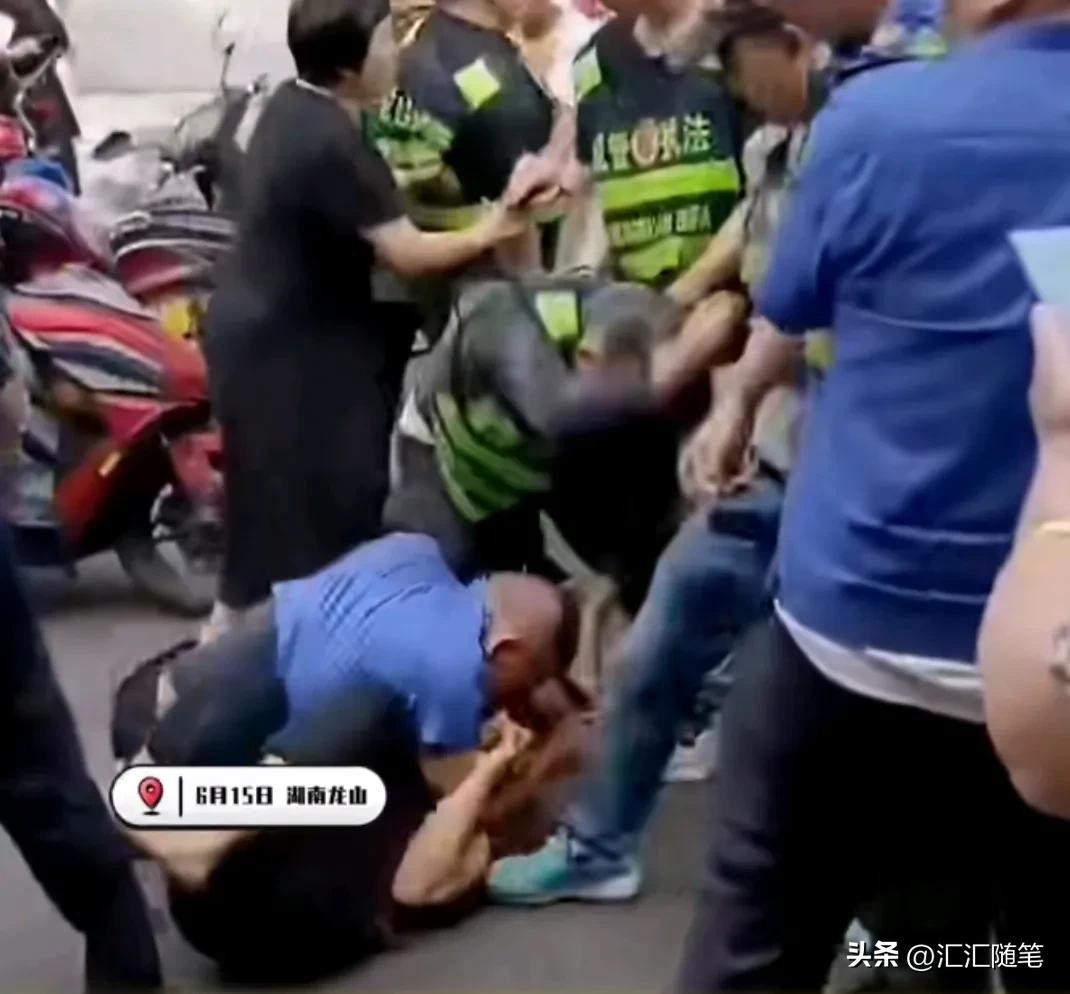 6月15日,有网友反映在湖南龙山县,有多名城管人员与附近商户发生冲突,从网传视频中显示,一名身穿红色短袖的男子被城管按在地上,这些城管中有的穿着执法背心,有的穿着蓝色制服,