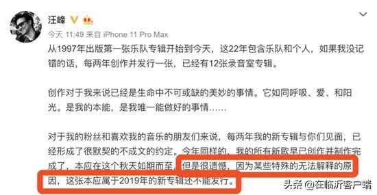 10月30日,汪峰原本要发布新专辑的,但让人没想到的是他似乎提前有了征兆,表示:“很遗憾,因为某些特殊的无法解释的原因,这张本应属于2019年的新专辑还不能发行。”