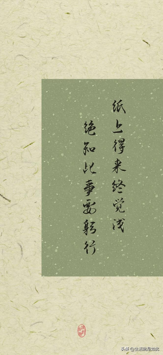 出自宋代陆游的《冬夜读书示子聿》意思是,从书本上得来的知识毕竟不够完善,要透彻地认识学习知识这件事还必须亲自实践。学习知识的过程中,我们常常沉迷于书本的理论。可这句诗告诉我们,光有理论远远不够。就拿学游泳来说,你把游泳的动作、技巧背得滚瓜烂熟,可如果不跳进水里亲自练习,永远也学不会真正游泳。在工作中也是,我们看了很多职场攻略,但若不亲身去经历项目,处理各种人际关系,根本无法真正掌握职场生存之道。只有将知识运用到实践中,才能将它变成自己的,才能深刻领悟其中的精髓。