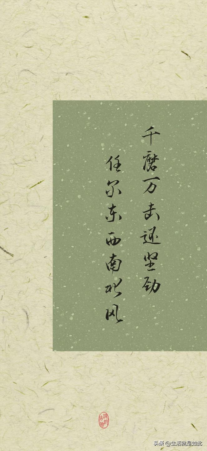 出自清代郑燮的《竹石》意思是,历经无数的磨难和打击身骨仍然坚劲,任凭你刮东西南北风。人生之路,风雨不断。这句诗就像一位坚毅的智者,在我们面对挫折时给予鼓励。就像那些在困境中坚守梦想的艺术家,不被外界的质疑、贫困的生活所打倒,依然执着地追求艺术的真谛。他们在艰难困苦中磨练自己,每一次的打击都让他们更加坚韧。无论生活给予怎样的狂风暴雨,都不能动摇他们内心的坚定,这种精神激励着我们在面对困难时,勇敢地挺直脊梁,绝不退缩。