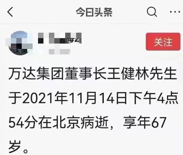 11月14日晚间,一则“万达集团董事长王健林先生去世”