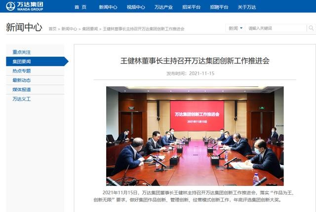 记者从万达集团官网获悉,11月15日上午,万达集团董事长王健林主持召开万达集团创新工作推进会,落实“作品为王、创新无限”要求,做好集团作品创新、管理创新、经营模式创新工作,年底评选集团创新大奖。