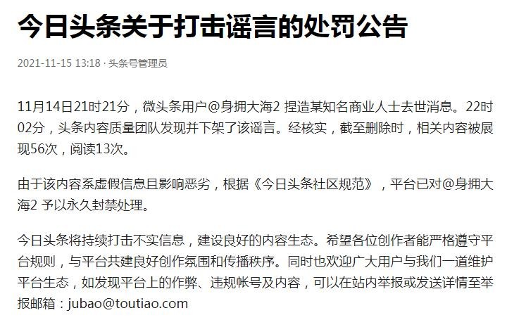今天下午,头条号管理员发布《今日头条关于打击谣言的处罚公告》称,11月14日21时21分,微头条用户@身拥大海2 捏造某知名商业人士去世消息。22时02分,头条内容质量团队发现并下架了该谣言。经核实,截至删除时,相关内容被展现56次,阅读13次。