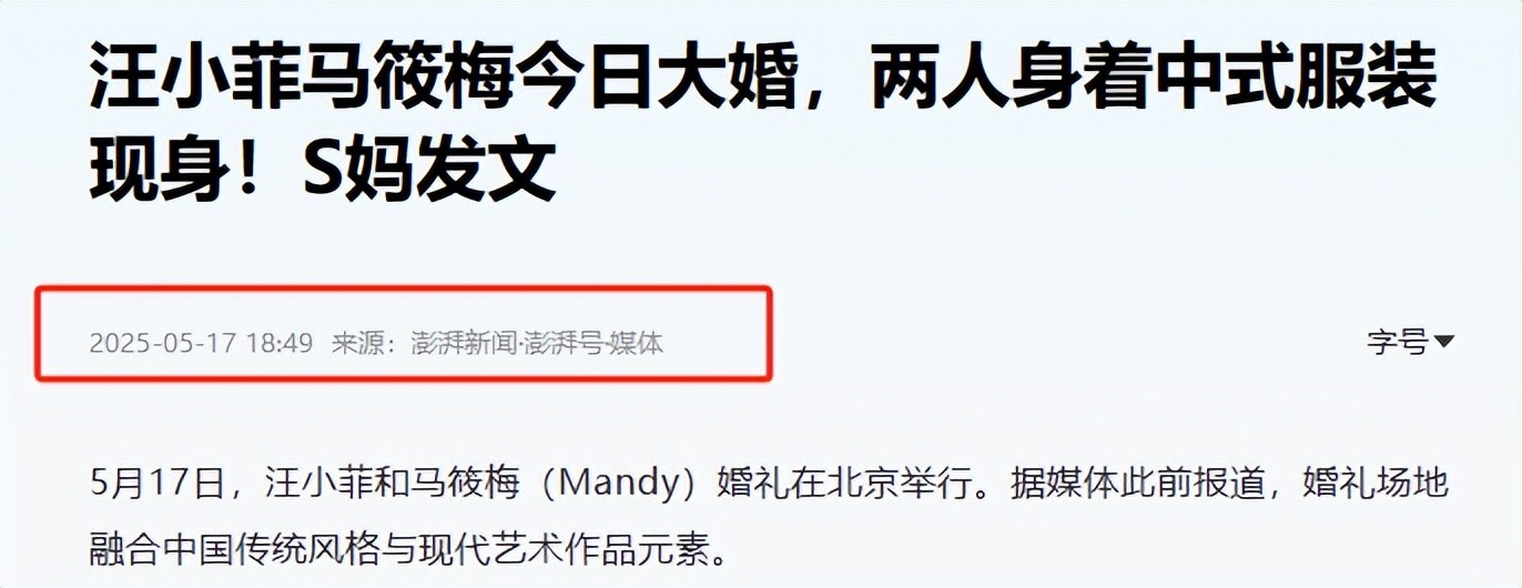 1.澎湃新闻:《汪小菲马筱梅今日大婚,两人身着中式服装现身!S妈发文》-2025-5-17