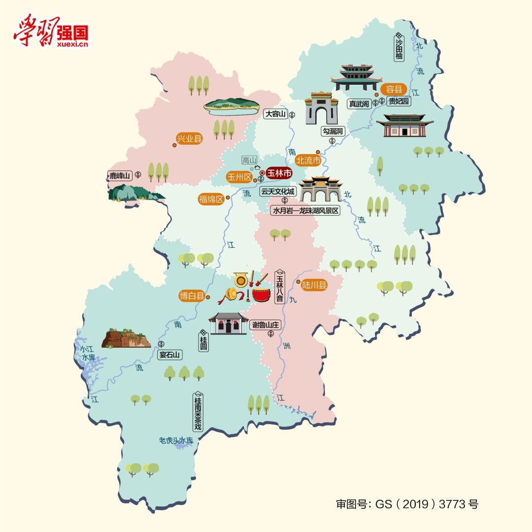 玉林农业发达,物产丰饶,有“广西粮仓”之称。丹霞地貌和岩溶地貌景观遍布,旖旎秀丽的南国山水风光和独具特色的人文景观相互交融,被世人誉为“岭南美玉、胜景如林”,自古享有“岭南都会”之美名。境内有“天南杰构”真武阁、全国四大名庄之一——谢鲁山庄等风景名胜。