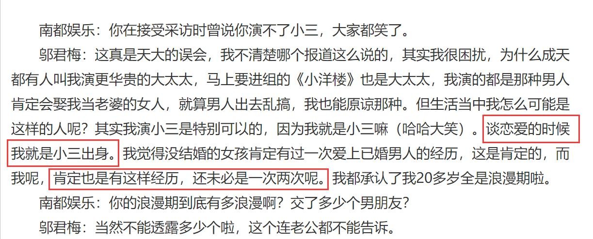 当被记者问到是不是演不了第三者的角色时,她直接辟谣表示希望自己可以尝试更多的角色,随后她更是爆料,谈恋爱的时候自己也曾当过第三者。