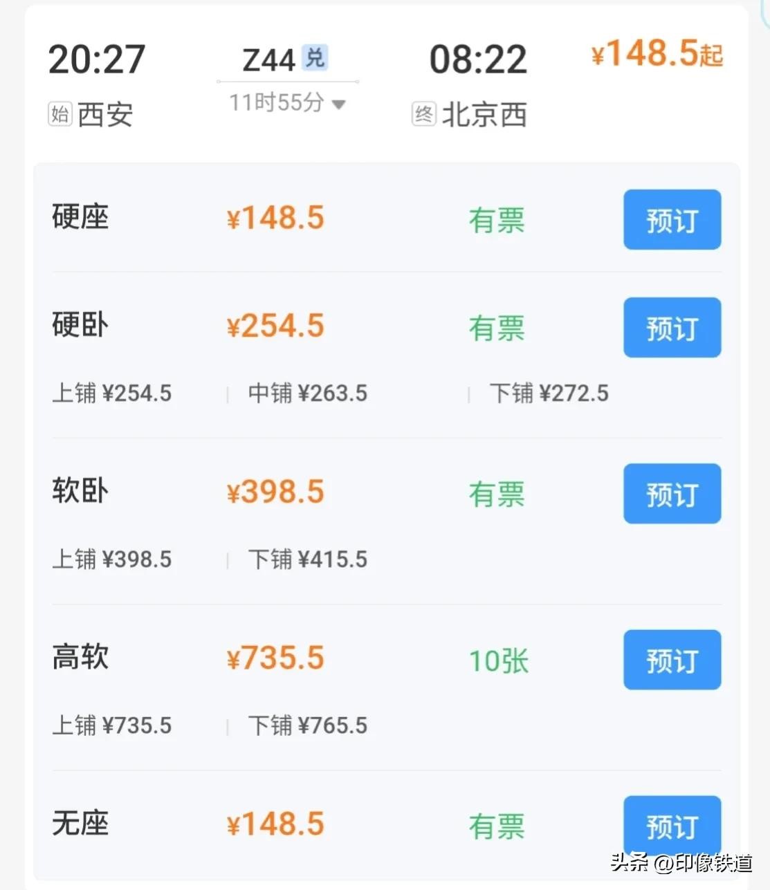 Z44次直达特快旅客列车,西安站至北京西站,全程票价: