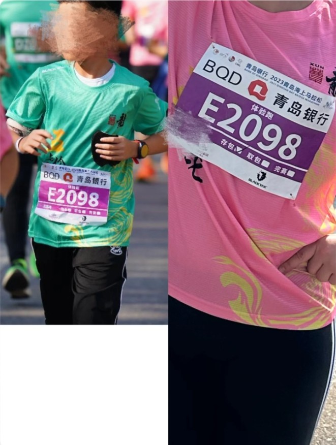 此外,还有网友爆料,称在青岛海上马拉松同一赛事上出现了多人佩戴同一号码牌的现象,并晒出体验跑同为“E2098”号的两名跑友在现场参赛的照片。