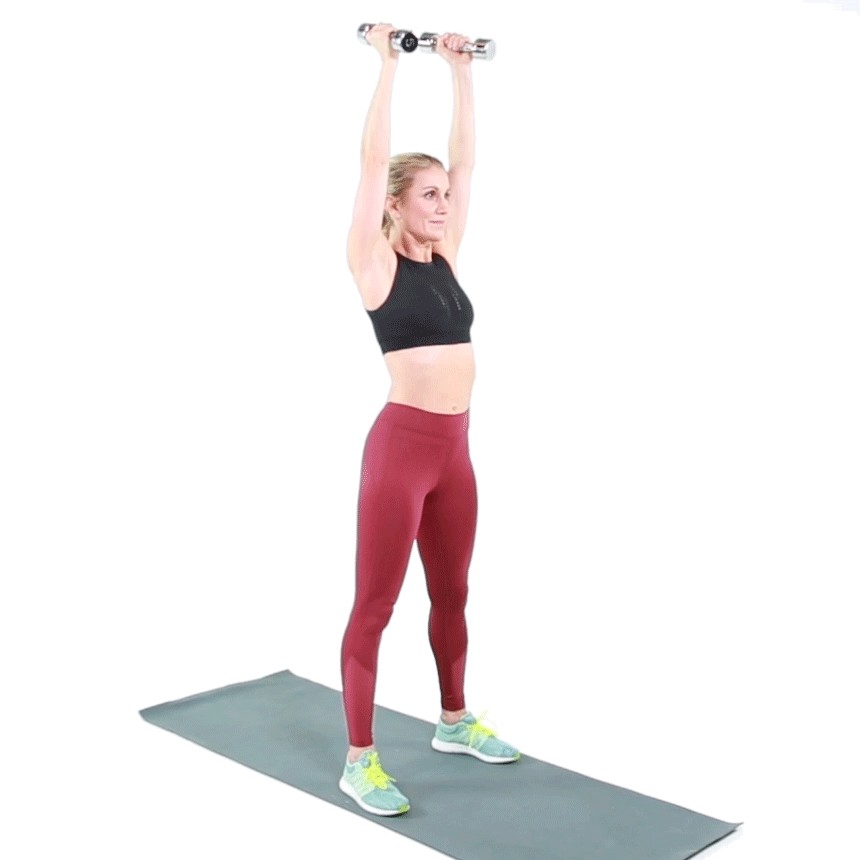 这个动作可以徒手,也可以准备一个哑铃或壶铃(选择中等或较重的重量)。