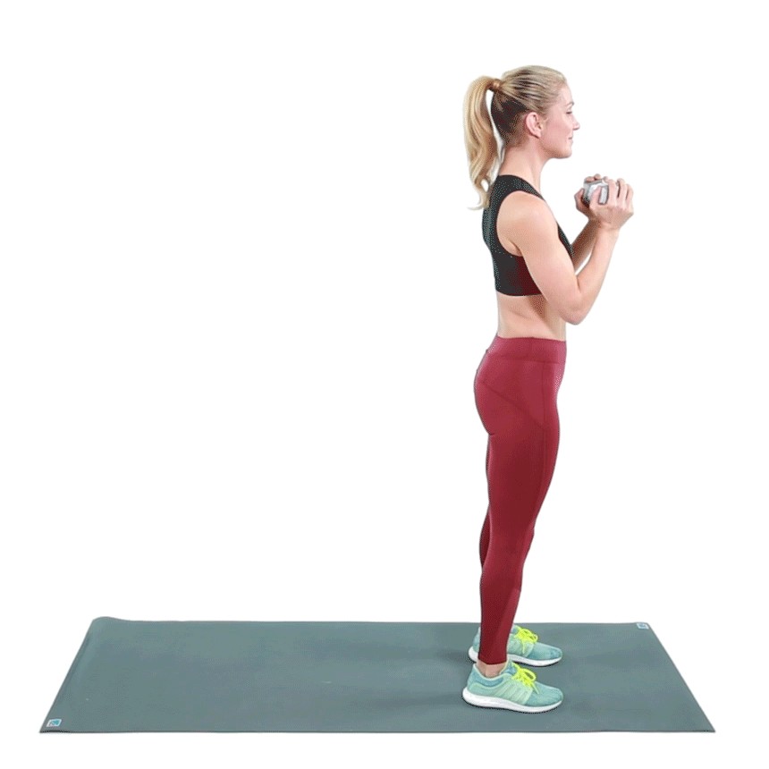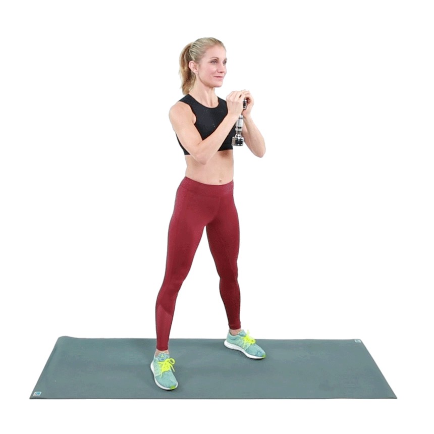 双手将哑铃或壶铃握住,举在胸前,两脚与臀部同宽。
