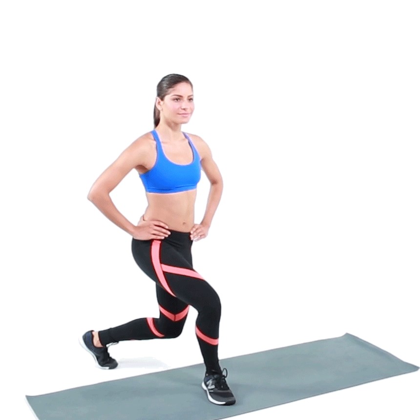 左脚跟抬起,保持背部挺直,腹部紧绷。