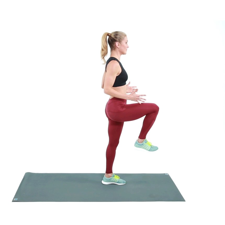 将左脚抬离地面(始终保持90度弯曲),直到左大腿与地面垂直。