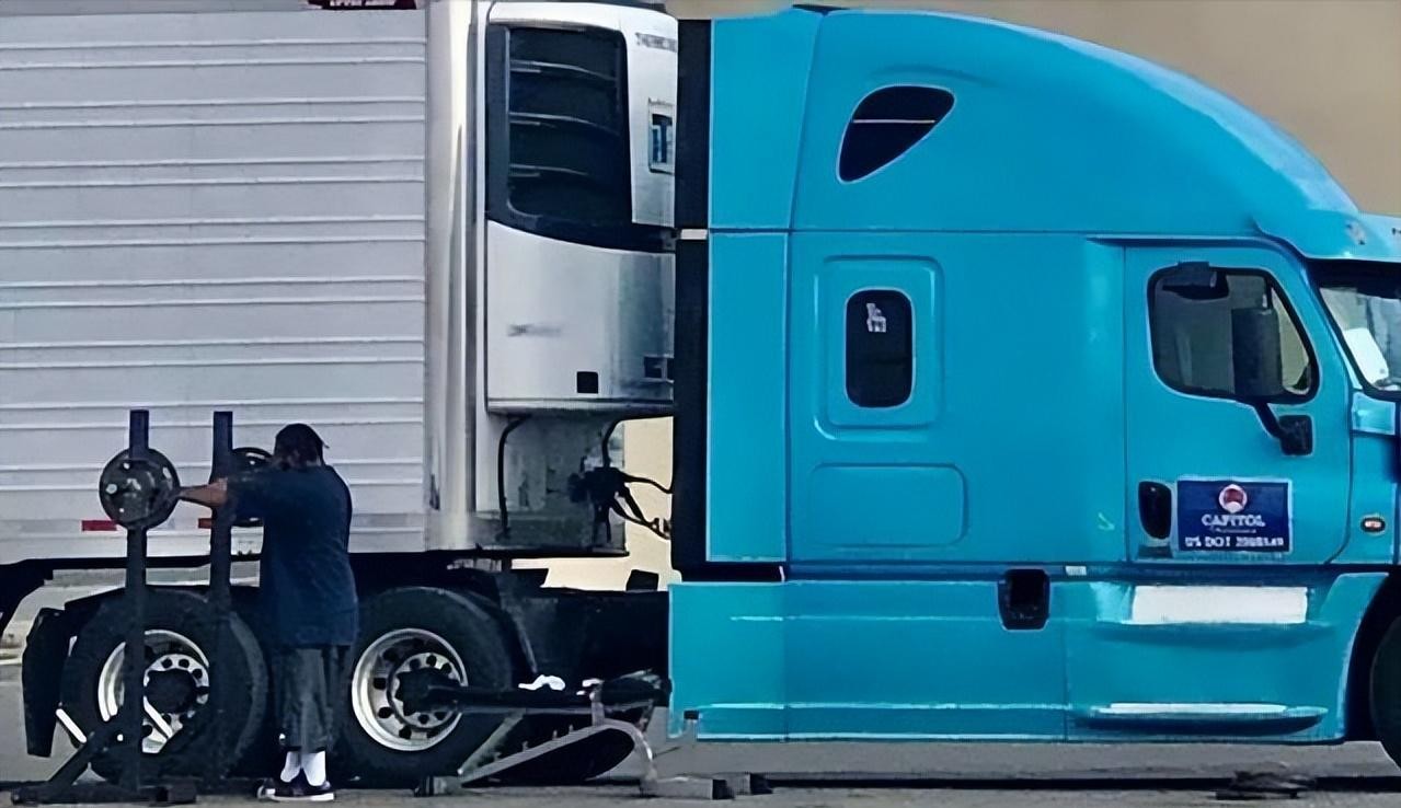 36、卡车司机在休息之余,也不忘将车上的健身器械搬下来,在路边进行锻炼。