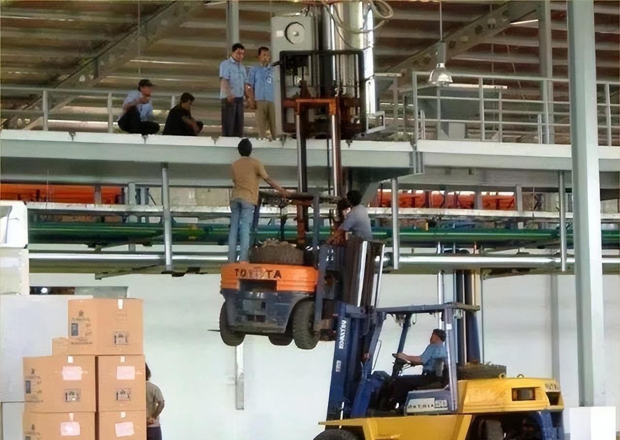 17、因为高度不够,工人们竟然想出这样危险的行为,用大叉车举起小叉车。