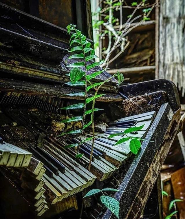 13、被废弃在树林之中的钢琴,从琴键之中长出一小株植物。