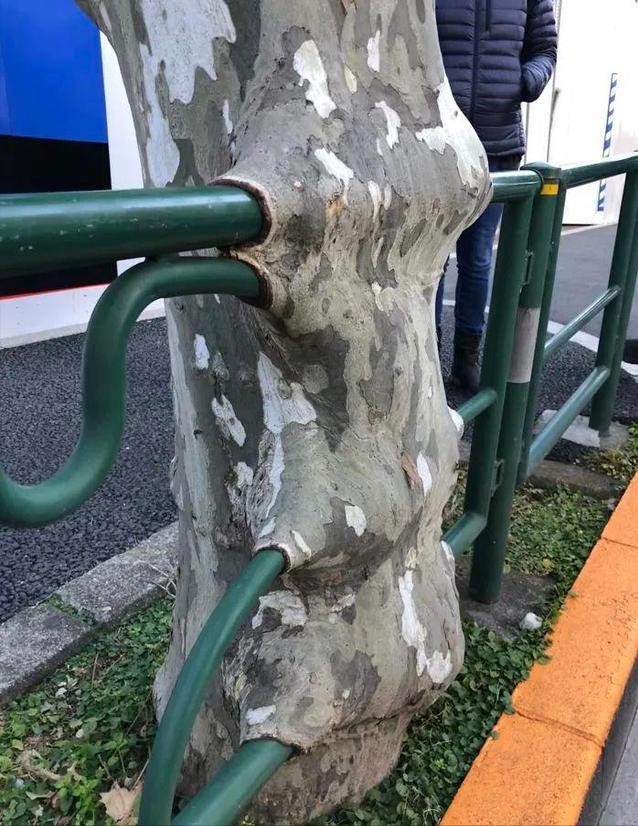 28、此地的梧桐树,经过十多年的生长,把道路旁的栏杆都给“吃掉了”。
