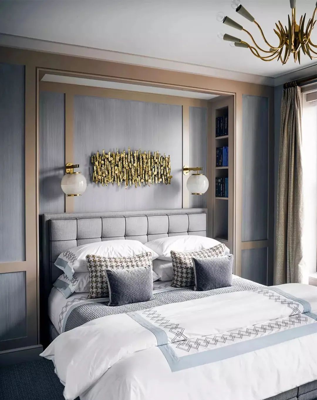 Art Deco有着经典独特的装饰图案,如放射状的太阳、简洁对称的几何图形、机械化代表的齿轮造型等。在色彩上,运用高级灰、金属色、米白色等质感强烈的色系去呈现含蓄内敛的奢华感。