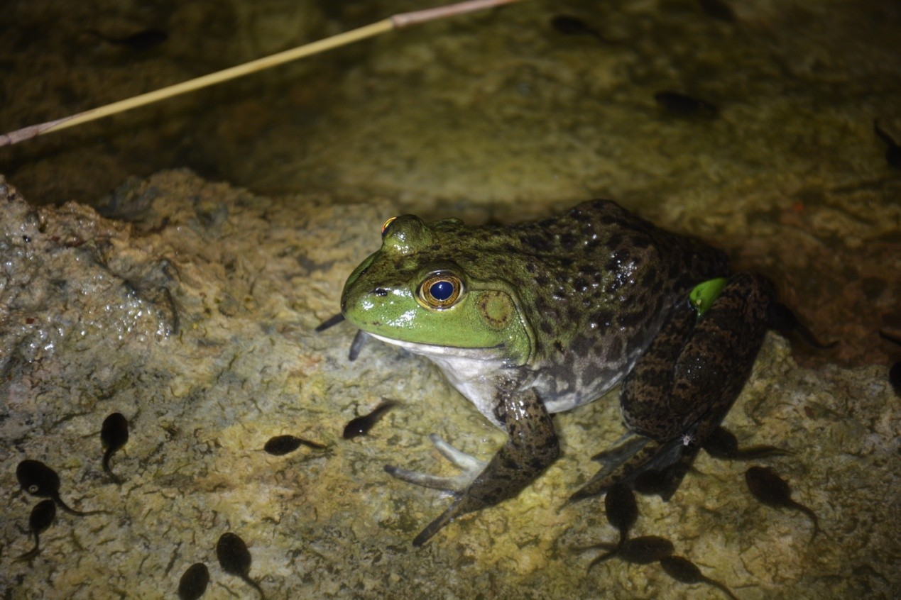 ▲牛蛙正在捕食中华蟾蜍蝌蚪