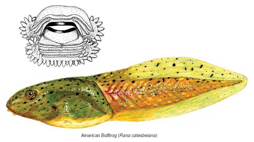 ▲牛蛙蝌蚪和口部形态特征(图片来源:维基百科)