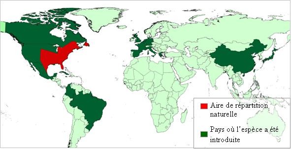 ▲牛蛙分布图:红色为原产地,墨绿色为扩散地(图片来源:维基百科)
