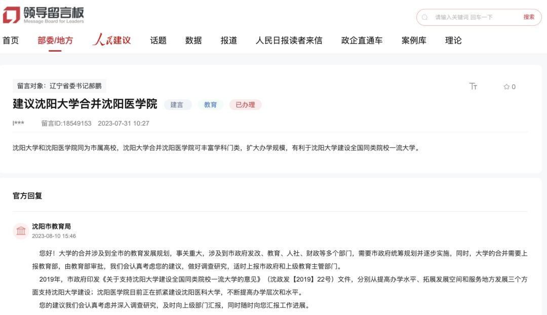 此前,有网友在人民网领导留言板上提出,“建议沈阳大学合并沈阳医学院”。