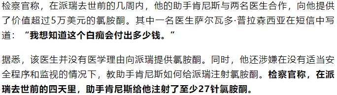 医生萨尔瓦多·普拉森西亚的行为更是令人震惊。他不仅无视医学伦理,还在没有适当安全程序的情况下,教助手如何注射氯胺酮。他们甚至毫不掩饰地在短信中讨论派瑞的“价值”,仿佛在谈论一件毫无生命的商品。这种冷血和残酷的态度,揭示了事件的深层次问题:在金钱面前,生命变得如此脆弱和廉价。
