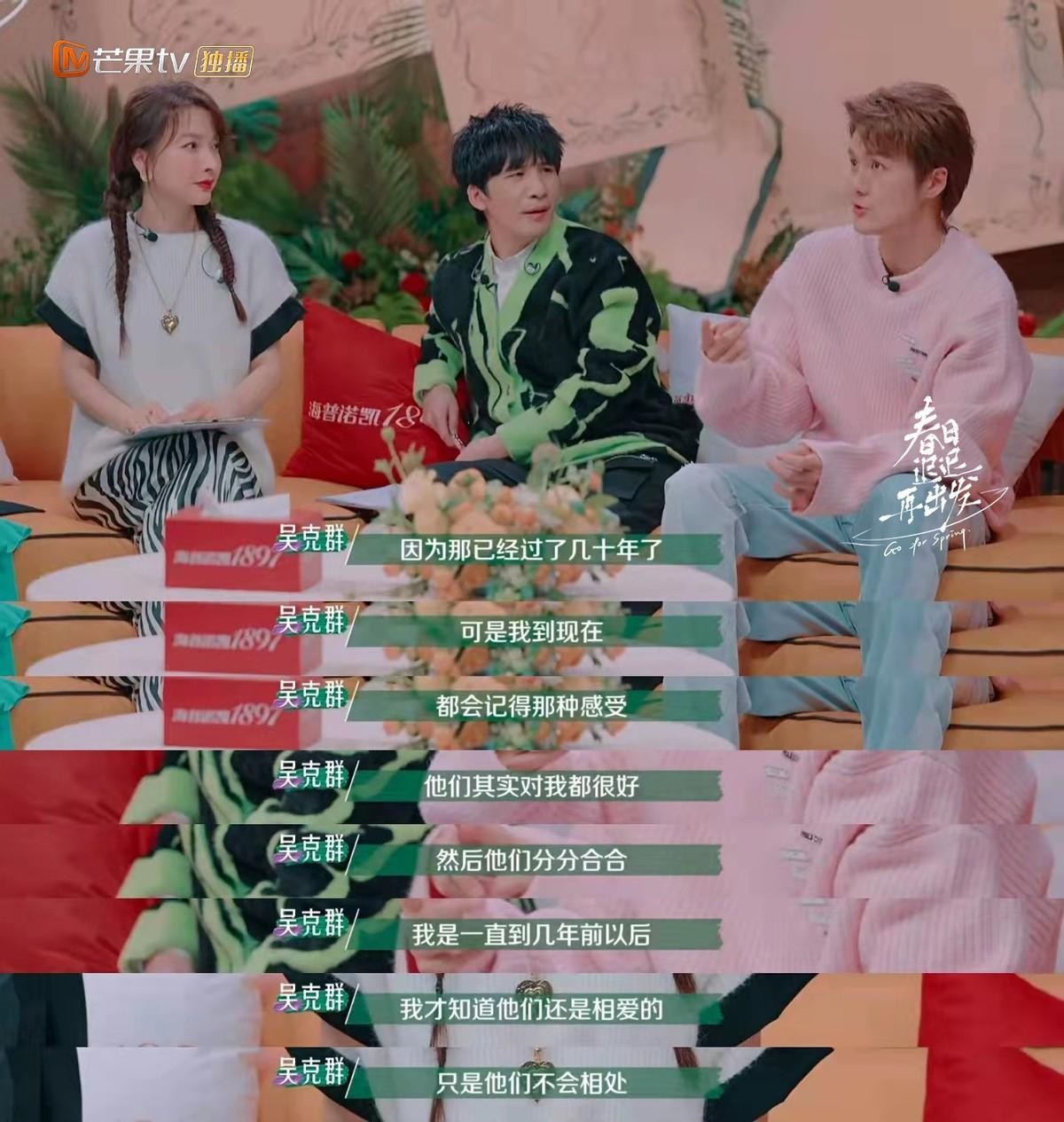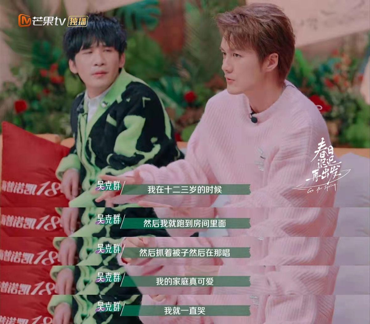 在感情里面受伤,然后怀疑是不是自己的错,吴克群也感同身受。从小在父母的争吵声中长大的吴克群,也开始害怕婚姻。吴克群回忆起自己十二三岁时,父母吵得实在是太凶了,他只能能自己跑到房间躲在被子里一边流泪一边唱“我的家庭真可爱”。吴昕直言小孩子太缺安全感了,只能以这种行为来安慰自己。即使已经过去了几十年,但谈起当年的经历,吴克群还是清楚地记得当时的感受。真是太让人心疼了,父母殊不知自己的一言一行都会对孩子留下阴影。小孩子是天真的,有些父母的话他是会当真的。