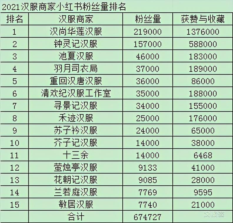 同时与去年相比,各商家的粉丝量增长很快,如汉尚华莲由去年的12万,增长为今年的22万,增长了75%;钟灵记由去年的1.9万,增长为今年的15.7万,达8.26倍;池夏由去年的1.1万,增长为今年的4.6万,达4.18倍。进入前十五强的粉丝总数为675875人,进入前十的粉丝总量为628000人,高于去年的219249人,达2.86倍,具体详情请见下表,由此可知,入驻小红书的汉服商家在大幅度增加的同时,商家的吸粉能力也很强。